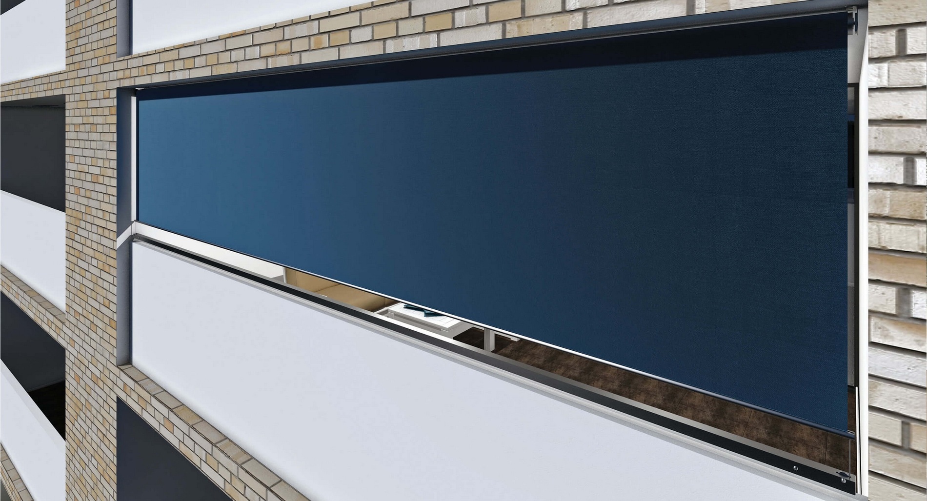 Le store peut être tendu en position fermée dans le bas par des ressorts. Il peut également être équipé d’un coffre pour la protection de la toile et du moteur ou avec des rails latéraux pour guider le store lors de sa descente.